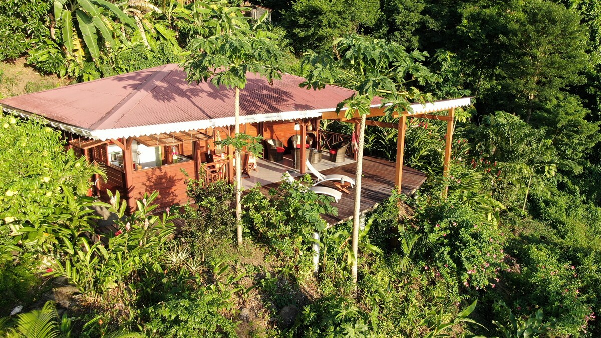 Tiny House encaramada en una colina a 400 metros de altitud en medio de un huerto frutal. accesible por un camino forestal en buen estado. Lugar tranquilo y aislado entre el mar y la montaña con una vista dominante. Alojamiento naturalmente fresco y ventilado sin mosquitos. Alojamiento ecológico. Situado a 10 minutos de la playa de Leroux a 20 minutos de la playa de Malendure a 20 minutos de la playa de Grande Anse Adecuado para personas que deseen desconectar, descansar o reponer energías.