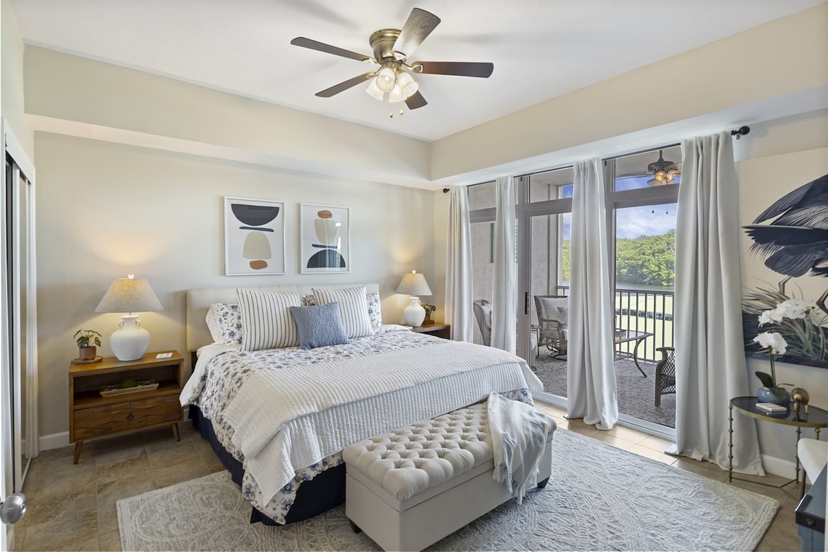 «¡Esto es todo!» Vista panorámica del canal principal de 3 millones de dólares, entrada a nivel, dos televisores Roku de 58 pulgadas, cama tamaño king, chimenea eléctrica, terraza cubierta, plancha eléctrica Blackstone, piscina de agua salada, muebles de terraza, tumbona Papasan, café Keurig, wifi de 400 Mbps... ¡y una hamaca! El refugio perfecto para parejas, pero lo suficientemente grande para una familia pequeña... ¡Nos encantaría hospedarte en Lakescape Romantic Retreat! Creemos que nuestro apartamento cumple con tantos requisitos que dirás, tal como lo hicimos nosotros: «¡Esto es todo!»