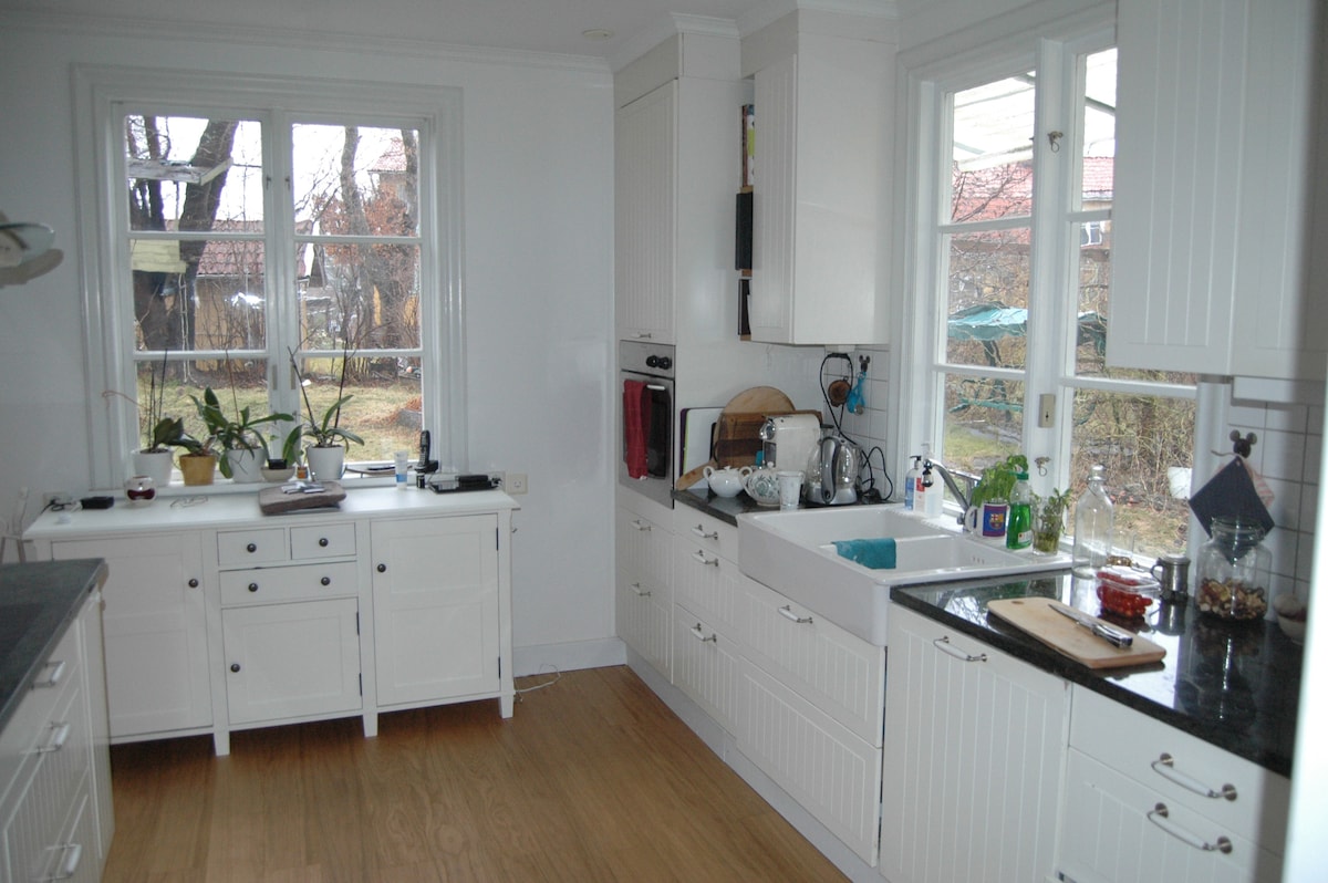 A wonderful 260 sqm house in classic Enskede. 5 bedrooms a new spa-area with jacuzzi, sauna & luxury shower. Amazing patio with sun set, sofa out door dining table and grill. The charming house has mini-theatre, open fire, spacious rooms, PS5, Oculus Quest, HBO, Netflix, pinball machine , etc The streets are child friendly, beautiful and calm. The garden is amazing w fruit trees and flowers and toys. Bikes to borrow! 5 min walk to subway, 10 min centre.