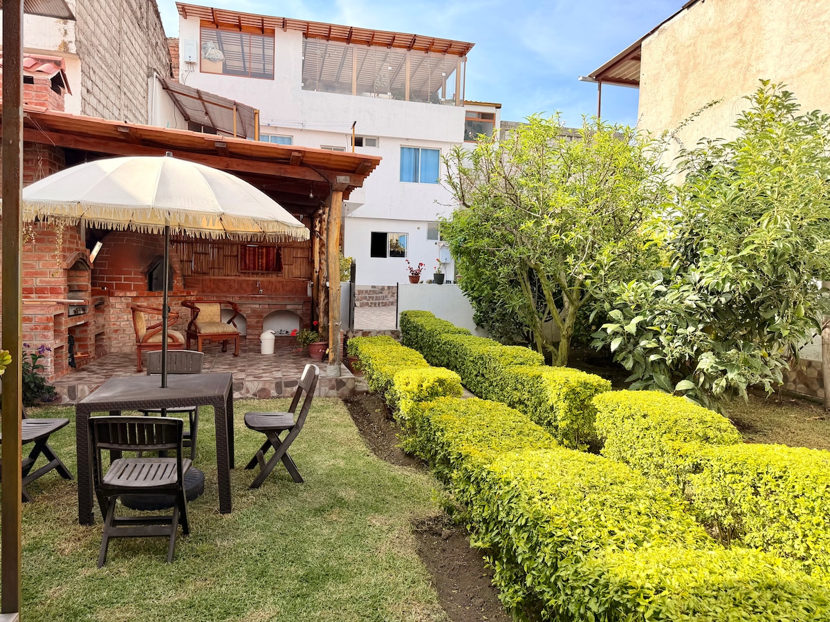 Hermosa y moderna casa grande con jacuzzi y estacionamiento privado. Un espacio tranquilo, ideal para el descanso, rodeado de áreas verdes y equipado con parrilla para disfrutar en familia o en pareja. 1er piso se encuentra todas las áreas sociales y suite privada con yacuzzi para huésped. 2do piso sin acceso zona ocupada por la anfitriona. Total independencia para tener privacidad.