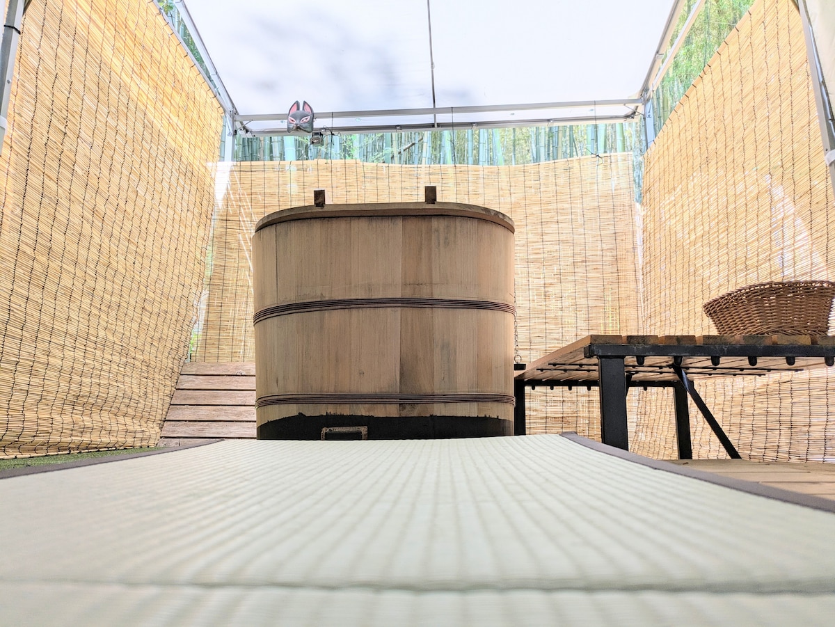 Nuestra posada es una posada tranquila rodeada de bosques de bambú donde puedes pensar que has venido a Kioto, y por la noche, puedes ver el hermoso cielo nocturno. Está a 20 minutos a pie de la carretera general hasta el santuario Fushimi Inari Taisha y a 16 minutos a pie del monte El hermoso camino natural del bosque de bambú de Inari.Hay varias empresas misteriosas en el camino al Senbon Torii. La estación más cercana, Keihan Railway, Ryukoka Omae Fukakusa Station, está a 18 minutos. Hay estacionamiento gratuito disponible en el alojamiento. Limitado a un grupo por día (todo el primer piso de una casa de dos pisos es privado, no hay propietario común, excepto la entrada) Incluso si tienes algún problema, hay un propietario en el segundo piso, para que puedas estar seguro. Una cama de matrimonio y tres camas individuales. Totalmente equipado con un sofá reclinable eléctrico y un televisor de 65 pulgadas con visualización de Netflix.Wifi gratuito, una mesa en la terraza privada de madera del huésped y una variedad de sillas. Debido a que no hay casa cerca, no hay ningún problema con conversaciones ruidosas o música hasta altas horas de la noche, por lo que puedes pasar un rato relajante como si estuvieras pasando tiempo en casa. Hay un baño al aire libre hecho a mano donde puedes darte un baño en el patio trasero con vistas al bosque de bambú.Por la noche, el bosque de bambú circundante está bellamente iluminado. Desayuno Ingredientes Bebidas Servicio gratuito de frutas. ¡★Uber Eats está disponible!Seleccioná tu propia tienda y hacé el pedido.