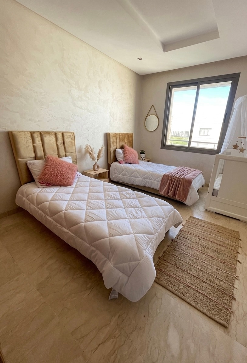 Un logement élégant et moderne au centre de la ville , parfait pour un séjour urbain alliant confort et accessibilité. à proximité de l’Hôtel Golden Tulip Farah, de la clinique internationale Agdital et de l’ENSA. Il offre une ambiance décontractée, un extérieur lumineux et un design contemporain. ✨ Points clés : - Emplacement stratégique en centre-ville. - À 2 km du complexe sportif du Phosphate et de la gare.