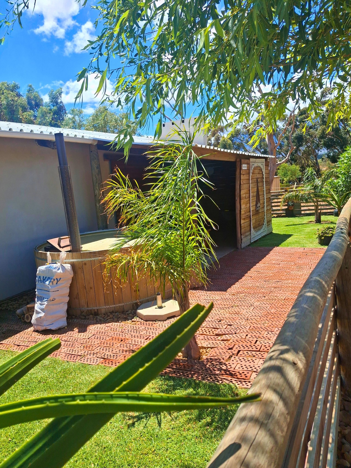 La cabaña está separada de la casa señorial. Tiene aire acondicionado y una cama doble (se puede convertir en 3 individuales), baño privado con ducha, un stoep cerrado con asientos y una chimenea, y cocina pequeña con heladera, microondas y placa de inducción.