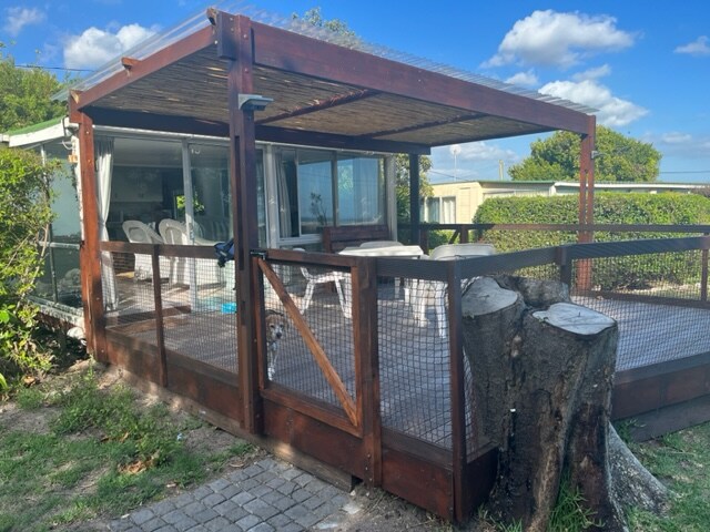 La cabaña está situada justo en el borde de la laguna del río Bot. ¡Tiene un gran jardín y las vistas son fantásticas! A poca distancia a pie de la playa y cerca de la piscina comunitaria y las canchas de tenis. Acogedora cabaña de madera de 2 dormitorios de dos pisos, con dos baños. Cama tamaño queen, cama doble y cama individual en el entresuelo. Los caballos salvajes a menudo pastan delante de la cabaña y, a veces, ¡hay cientos de charranes y flamencos! Totalmente equipada para cocinar.