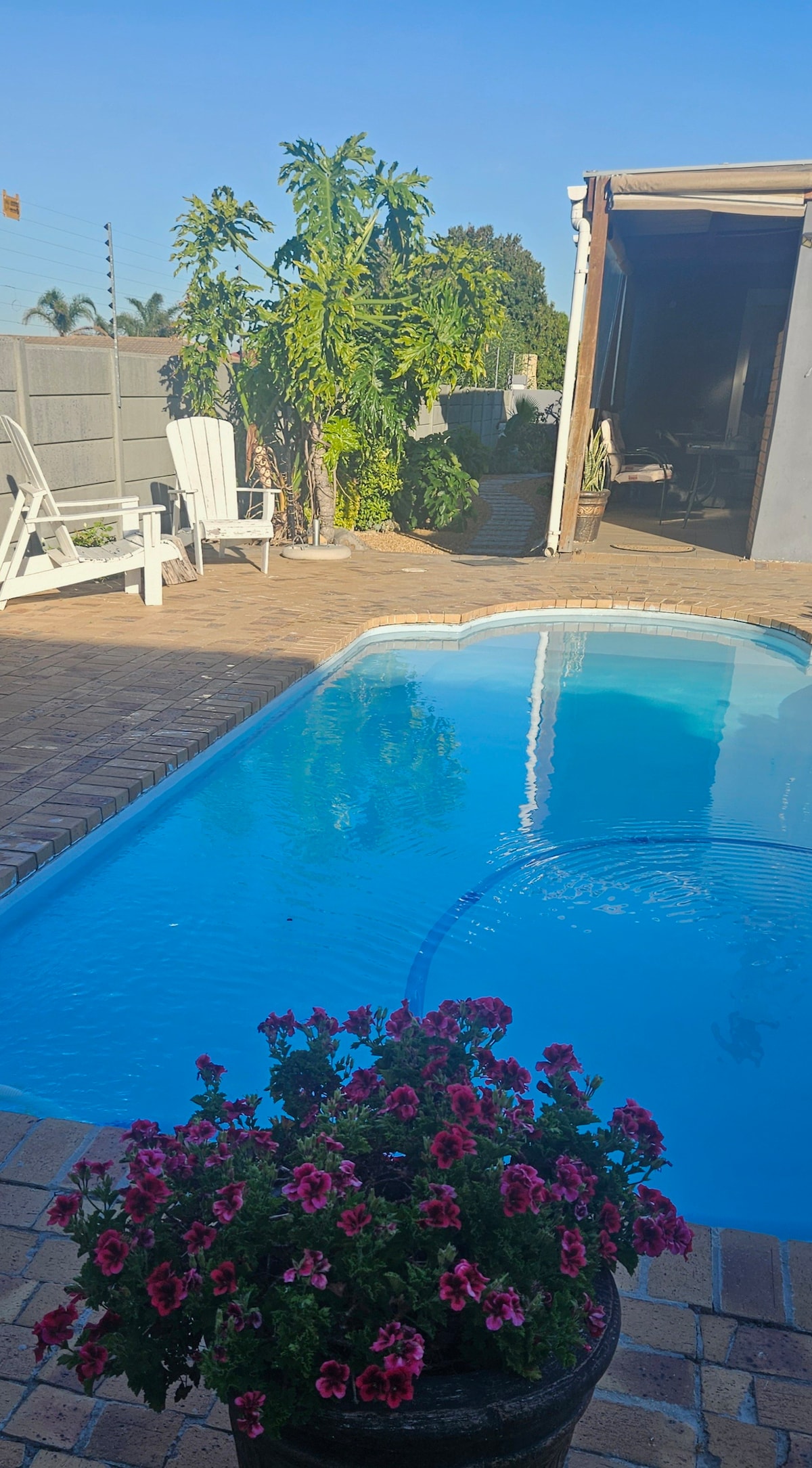 Mi casa se encuentra en el centro de Hermanus. Te encantará mi propiedad por su tranquilidad y ubicación céntrica. El alojamiento es ideal para 2 parejas y una sola persona. Hay una pequeña cocina donde puedes preparar tu propio desayuno. Se proporciona café y té. No es apto para preparar comidas más grandes. Tenemos 50 restaurantes y comida para llevar cerca. Se incluye un televisor inteligente con Netflix, YouTube, ZDF, etc. y wifi ilimitado. Los huéspedes podrán acceder a una zona de estar exterior privada.