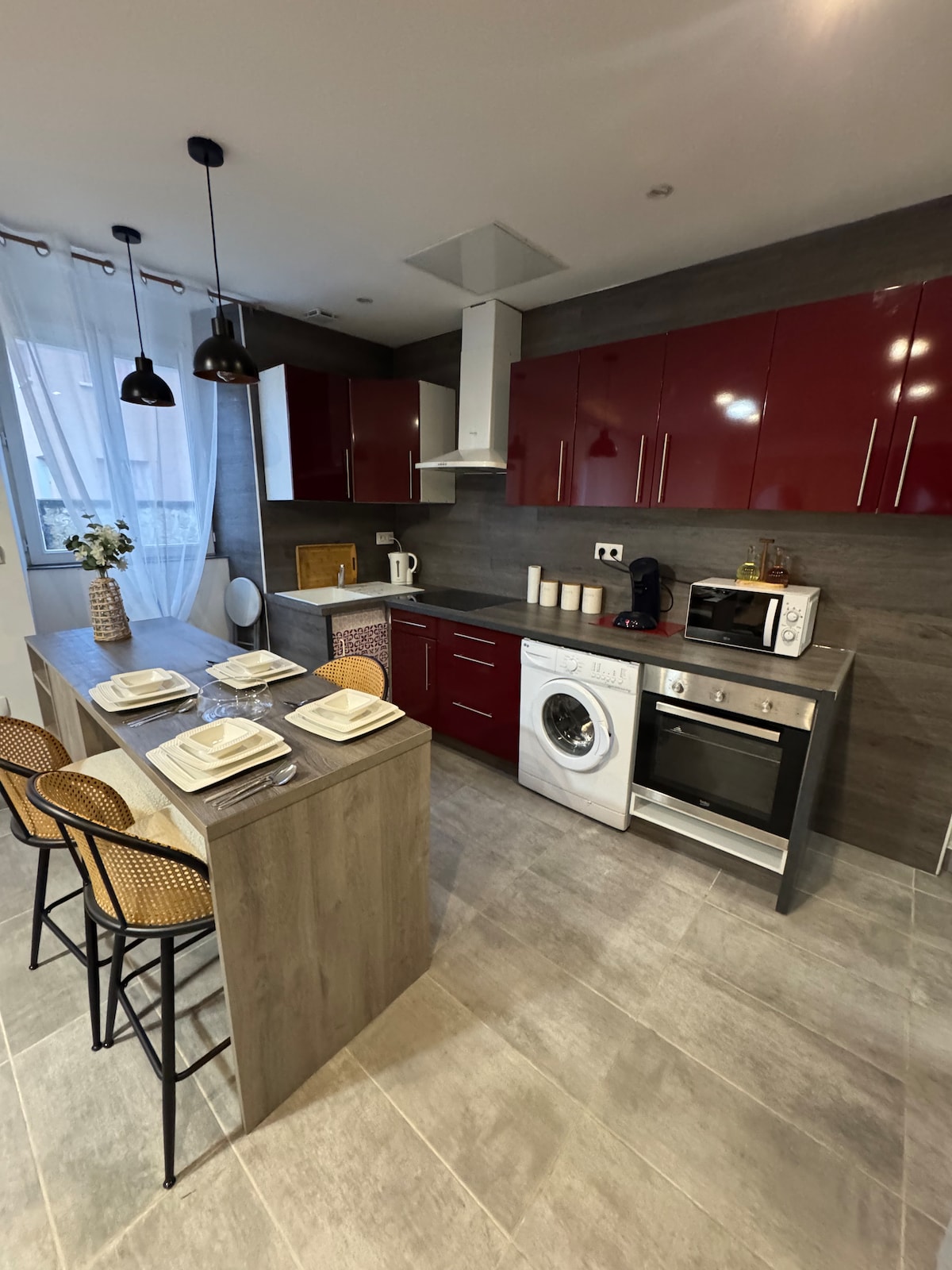 Charmant T2 situé en plein centre-ville, idéal pour un séjour touristique ou professionnel L’appartement peut accueillir jusqu’à 4 personnes et se trouve en rez-de-chaussée, offrant un accès facile et pratique Il dispose d’un lit confortable ainsi que d’un canapé convertible pour deux personnes La cuisine est entièrement équipée avec four, cafetière, et tout le nécessaire pour préparer vos repas. Le logement est fourni avec le linge de lit et les produits d’hygiène essentiels pour votre confort.