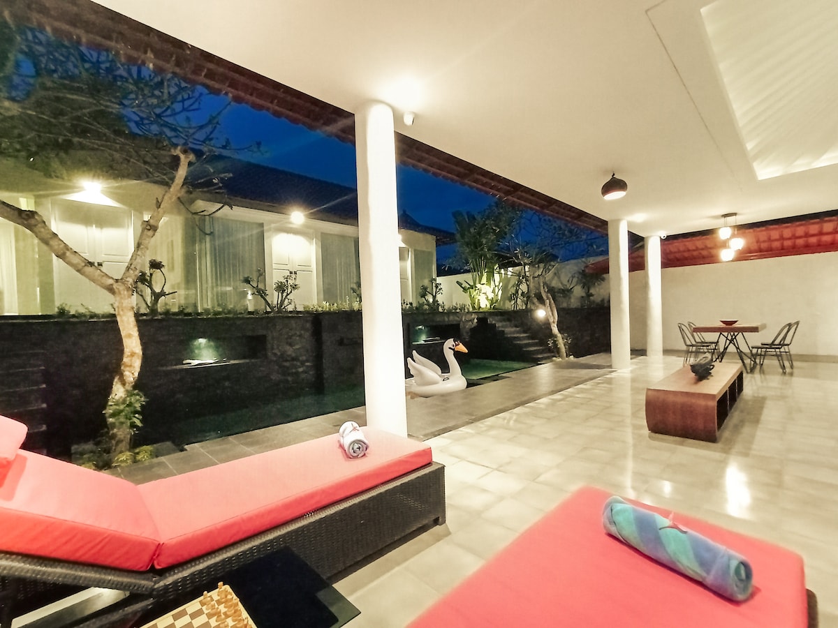 Villa nueva en el sur de Kuta: • Tres dormitorios elegantes con aire acondicionado y vista al jardín • 2 baños modernos con comodidades de primera calidad (suite principal con bañera) • Pileta enorme, jardín exuberante y patio para barbacoas y descanso. • Sala de estar abierta con puertas de vidrio del piso al techo • Cocina totalmente equipada. - Wifi de 300 Mbps. • Limpieza diaria, toallas y sábanas limpias • Cuna y trona bajo petición • Servicio de conserjería: traslados al aeropuerto, recorridos y más • Netflix, PS5 a pedido