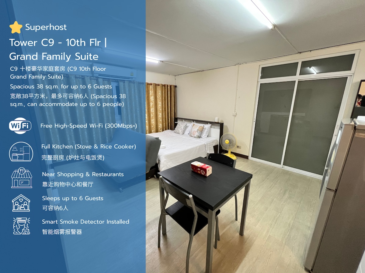 Spacious Family | High Floor City View | Near IMPACT Arena Ideal for families or groups of friends attending concerts and events at IMPACT Arena. This large studio comfortably sleeps up to 6 guests with a King bed, Queen bed, and 2 sofa bed. Highlights: ✅High-speed Wi-Fi ✅ Accommodates up to 6 guests (4 beds) ✅ 24/7 Self Check-in with Smart Lock ✅ Prime location near restaurants and shopping centers ✅ Entertainment: Smart TV พร้อม Xiaomi Box (Netflix) ✅ Safety First: ติดตั้ง Smoke Detector