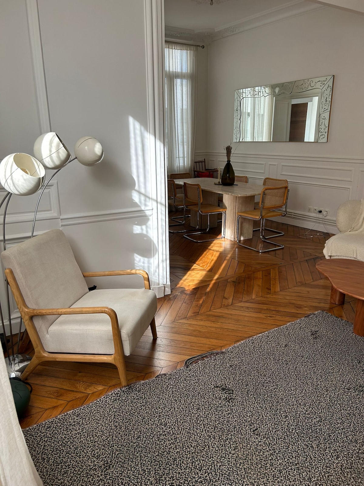 Elegante departamento Haussmann a solo 1 minuto de los Campos Elíseos. Luminoso, tranquilo y lleno de encanto parisino con techos altos, chimenea de mármol y pisos de parquet en espiga (pointe de Hongrie). Decorada con buen gusto con una mezcla de diseño vintage y moderno. Rodeado de Hermès, Goyard, los mejores restaurantes y boutiques de lujo. A pesar de su ubicación central, sigue siendo un refugio sereno y tranquilo en el corazón de París.