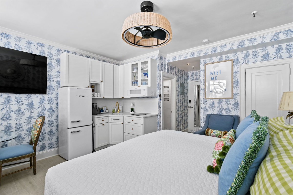 ¡Te damos la bienvenida al histórico hotel Palm Beach! Ubicación absolutamente perfecta para disfrutar del estilo de vida de Palm Beach y explorar todo lo que ofrece. ¡A pie de la playa, restaurantes y tiendas! ¡Aparcamiento gratuito! Apartamento de 1 dormitorio bellamente decorado con sala de estar y cocina americana separadas. Es una unidad luminosa y soleada de 389 pies cuadrados ubicada en el tercer piso con preciosas vistas a las palmeras. El dormitorio cuenta con una cómoda cama tamaño king y TV. La sala de estar cuenta con un sofá cama, TV y asientos adicionales.