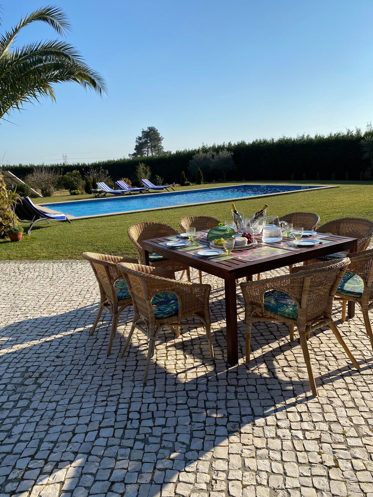 In the Setubal vineyard area 15 minutes from beaches and Arrabida. 30 minute drive from Lisbon. Minutes from Montado Golf Course. Tranquil 10 hectares, walk to horse back riding or to the charming town of Aguas de Moura to shop. All rooms access patio to pool, sauna, tennis court, fruit trees, peaceful tranquility to relax.