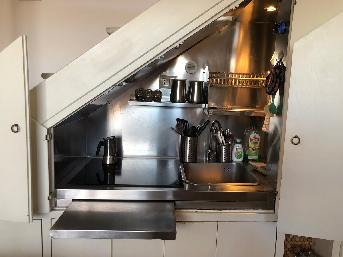 Este loft unico en su especie, rústico pero elegante, está lleno de detalles en madera, metal y piedra, todo hecho a mano por Giulio, su dueño. La fabulosa terraza te dejará sin aliento. ¿Qué tal un café en pantuflas mientras contemplas el Coliseo o ves la puesta de sol tras la sombra del Vaticano desde la bañera de la cabaña? Ubicado a minutos de la estación Termini, pero aún así, un hogar tranquilo. El acceso al apartamento se realiza por escaleras. ¡El desayuno corre por nuestra cuenta!