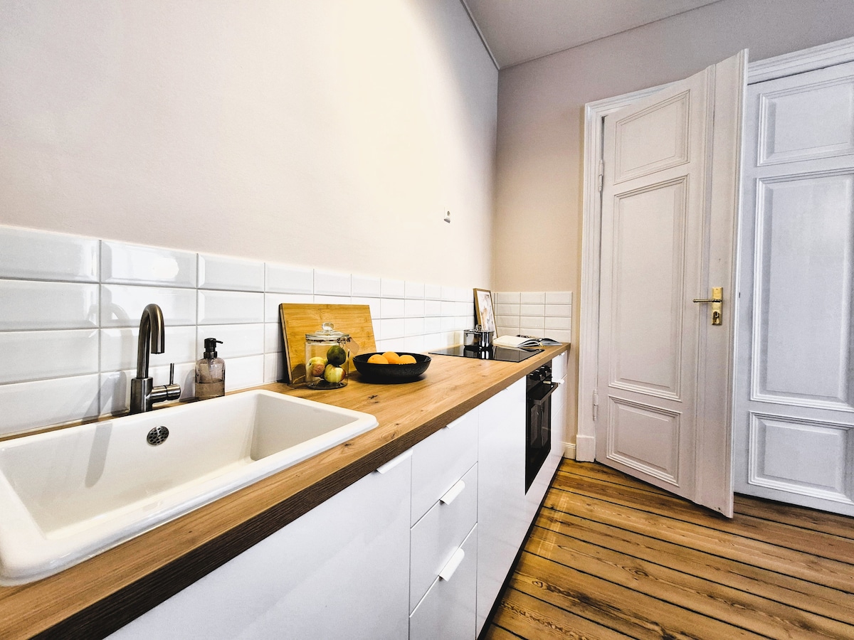 Rodeada solo de prados y campos, escondida detrás del estanque del pueblo, se encuentra la pequeña finca señorial con su casa principal y sus antiguos establos. Durante los últimos cinco años, la restauramos con mucho cuidado y le dimos una nueva vida a esta propiedad de 1899. En el piso superior de la casa señorial, un edificio de ladrillo típico de la región, te espera un espacioso departamento de 114 metros cuadrados lleno de luz. Las vigas antiguas vuelven a ser visibles. El interior es sencillo y no distrae.
