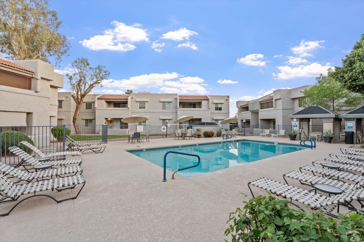 Wake up from your King Size bed and enjoy coffee on the private patio. Relax in your remodeled bathroom and built out closet before walking across the street to Spring Training or check out Talking Stick Resort and Casino! If you have extra guests there is a sleeper sofa for your convenience. Everything you need is across the street or minutes away! Canopy bed is now a platform bed. TPT# 21488926 SLN# 2025744
