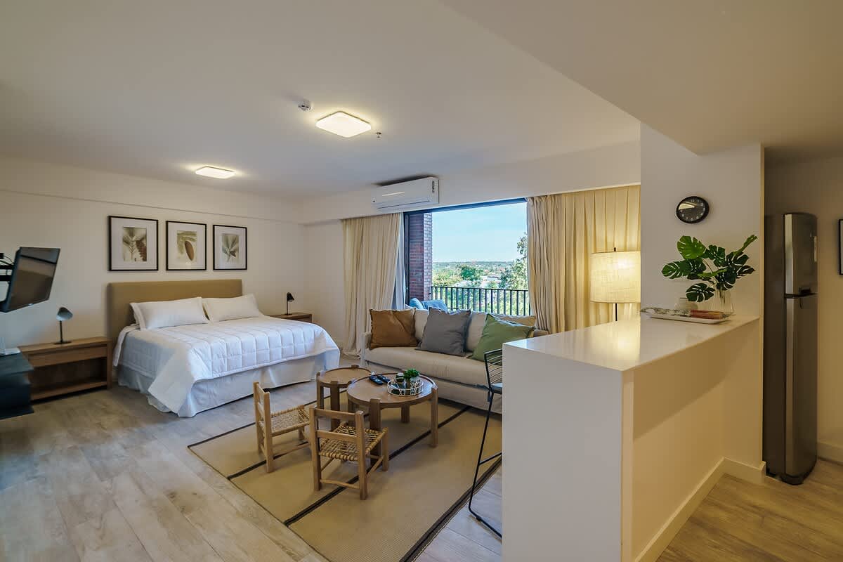 Monoambiente cálidamente decorado con baño privado, pequeño estar con sofá y comedor, placa de cocina, balcón propio. Edificio con guardia 24/7, estacionamiento bajo techo, rodeado de restaurantes, farmacia, tiendas de conveniencia, bares. Smart TV, jabón, toallas,ropa de cama, cocinita, ollas, microondas, A/C split, tendedero de ropa, heladera, cafetera, cubiertos, vasos, secador de pelo, enchufes para USB. Terraza con parrilla bajo pedido, con costo. Alojado en el corazón de Asunción.