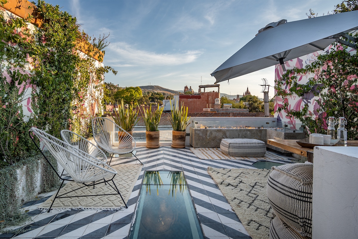 ¡El patio más alto de todo el vecindario - Casa de las Nuebes (casa en las nubes) no decepcionará! Un retiro perfecto en pareja o 2 amigos. Este hermoso estudio de diseño de interiores cuenta con todas las cualidades mágicas que a los visitantes les encantan de San Miguel. Caminar solo unos minutos desde el Centro hasta una unidad de condominio cerrada de 6 unidades que es muy segura y lejos del ruido del centro. ¡Disfruta de la impresionante vista de 360º de globos aerostáticos matutinos, puestas de sol y todo SMA!