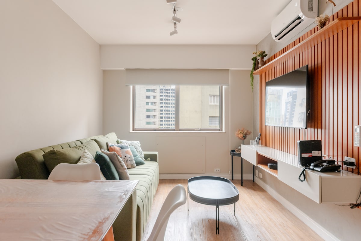 Boutique studio with one of the most beautiful views of São Paulo city. Placed 2 minutes walk from the subway. Fully equipped kitchen with refrigerator hidden by wooden door. Wi-fi, air-conditioning and smart TV 55 inches. Self check-in with smart electronic lock. Play tennis or go o gym and relax in the pools (outdoor or heated indoor) and saunas (wet or dry) afterwards. Common area also includes co-working spaces and laundry. Visitors need to be previously registered at the front dest.