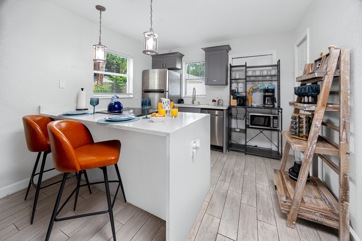 🌴 Escápate a tu propio paraíso, a solo una cuadra de las tiendas, cafés y Sims Park del centro histórico de New Port Richey, y a solo minutos de Green Key Beach. Este refugio de 1 dormitorio recién renovado cuenta con muebles completamente nuevos, una cocina moderna totalmente equipada, un televisor en el dormitorio para noches relajantes y un diseño luminoso con un paso afuera a un área de jardín tranquila. Ya sea que estés aquí para una escapada romántica, para trabajar a distancia o para vivir aventuras en la costa del Golfo, este alojamiento lo tiene todo.