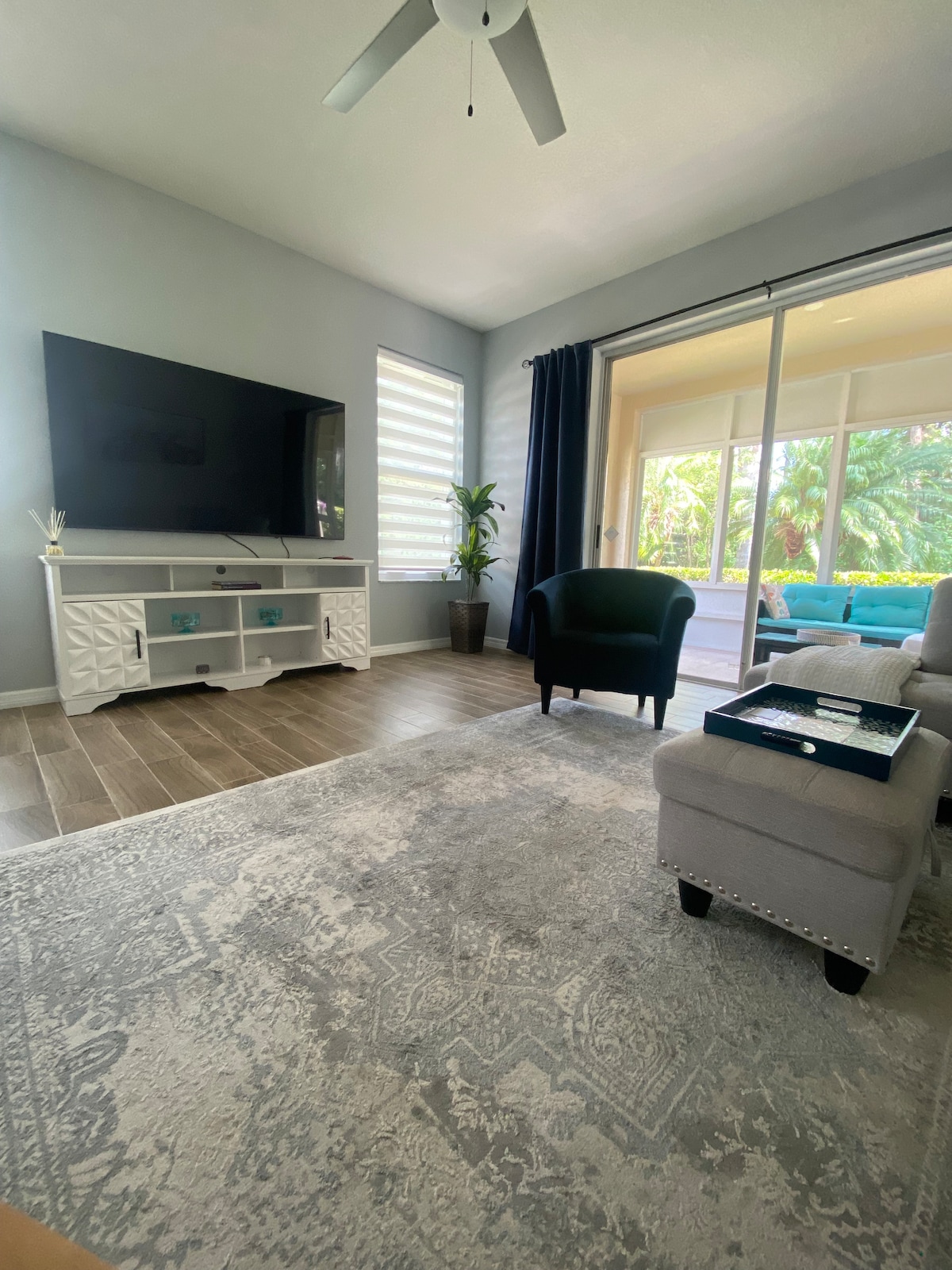 Villa tranquila y relajante que incluye 3 dormitorios: dormitorio principal con cama tamaño king con baño doble privado con tocador, otras 2 habitaciones con camas tamaño queen. Escritorio para trabajar o escribir. Segundo baño compartido completo con bañera. Lavadora y secadora. Lanai privado con espacio al aire libre. Acceso a 2 piscinas, gimnasio, canchas de baloncesto y tenis, pickleball, parque infantil. Todo ello ubicado en un hermoso campo de golf. Maravilloso lugar para relajarse y jugar al golf. Alquiler ideal para vacaciones o para teletrabajadores. Cerca de tiendas y atracciones.