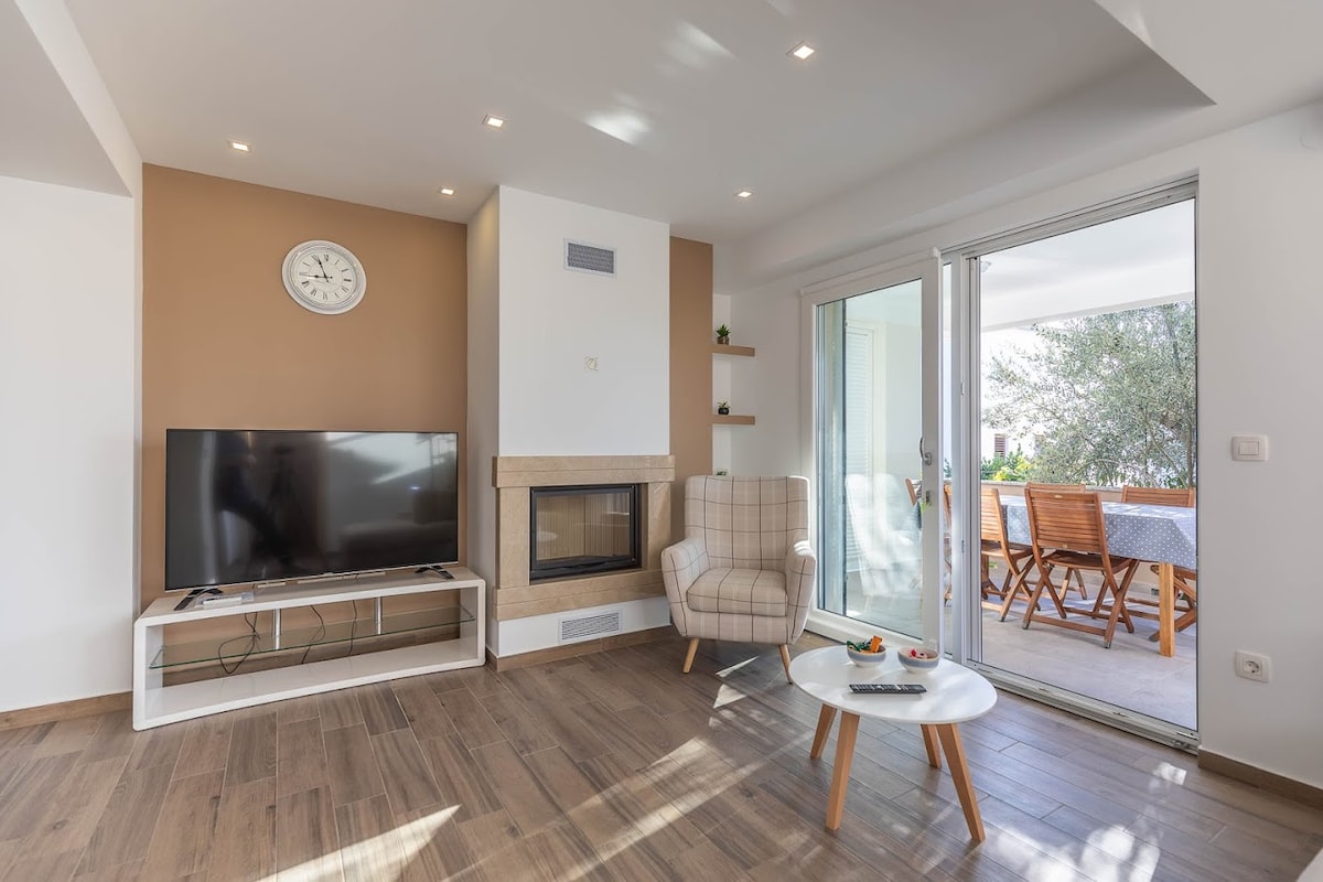 La casa está situada a 10 metros del mar. En el balcón, los apartamentos tienen jacuzzi privado para 5 personas. Delante de la casa, justo al lado del mar, hay un pequeño jardín con una parrilla y una gran mesa para 8 personas donde puedes disfrutar de la brisa del verano a la sombra natural. En la playa, colocamos nuestras tumbonas y sombrillas para que puedas disfrutar del mar y el sol. En frente de la casa está el amarre para el pequeño barco o moto acuática (hasta 6 m). Toda la familia puede alojarse en este lugar tranquilo.
