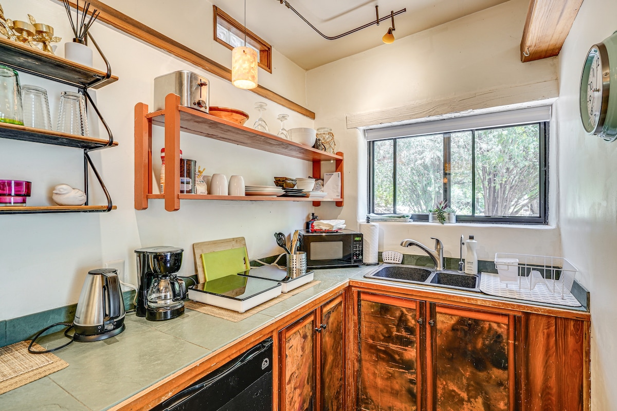 A guesthouse, nestled in a grove of mesquite trees, located just a block away from the local shops downtown awaits your arrival. A full kitchen, supplied with the basic conveniences, bedroom with queen size bed and twin sofa bed, and bathroom with shower, make this space a perfect fit for a couple or small family. The front living room has a futon couch and smart TV.