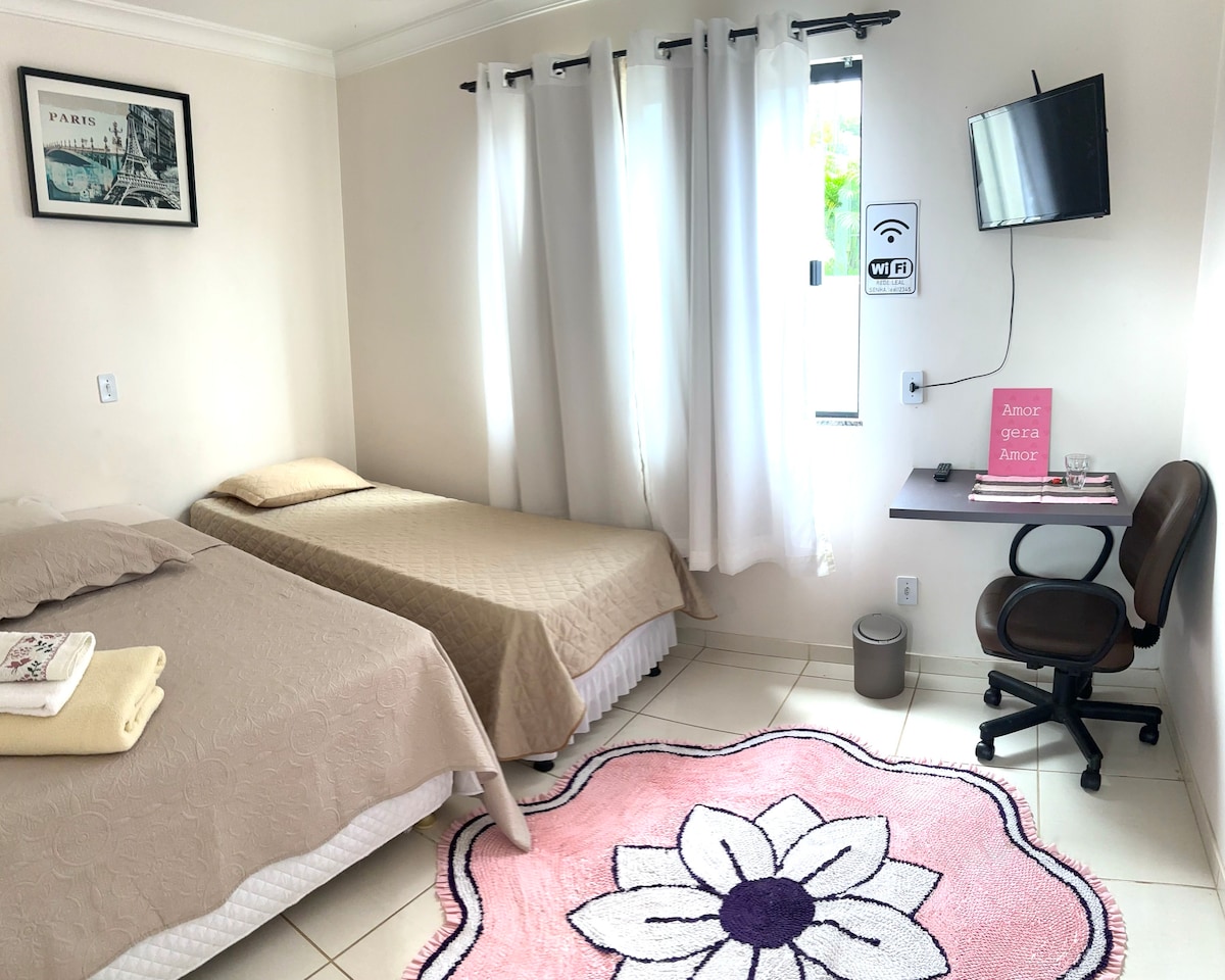 Pequena e aconchegante, a suíte conta com cama de solteiro, escrivaninha, frigobar, chaleira elétrica, armário e banheiro privativo, ideal para estadias curtas. Possui cozinha externa compartilhada. Localizada em uma região segura e tranquila, em frente ao Parque do Alvorecer, é perfeita para quem busca conforto e privacidade. Venha se hospedar nesse cantinho charmoso! Próxima à UNIDEP e UTFPR, ao lado (300 metros) do Centro de Eventos Pref. Astério Rigon!!