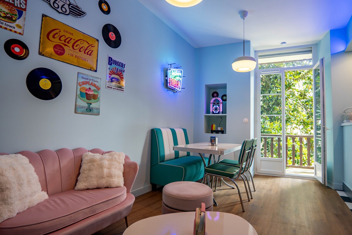✨🛁 Balneoterapia, Máquina de palomitas de maíz, Netflix/Disney+ sin anuncios: ¡Bienvenido a este capullo romántico estilo Diner US de los 60's, en el corazón de Pau! ¡🎲🎮 Nintendo Switch con juegos instalados y juegos de mesa están disponibles para variar los placeres! A pie: — Centro de la ciudad: 2 minutos — Castillo: 2 minutos — Estación: 14 min — Estacionamiento Verdun: 5 min (1,50 € / medio día) Todo está listo para recibirte: ropa de cama, toallas, batas, café, té, gel de ducha, champú y otros consumibles...