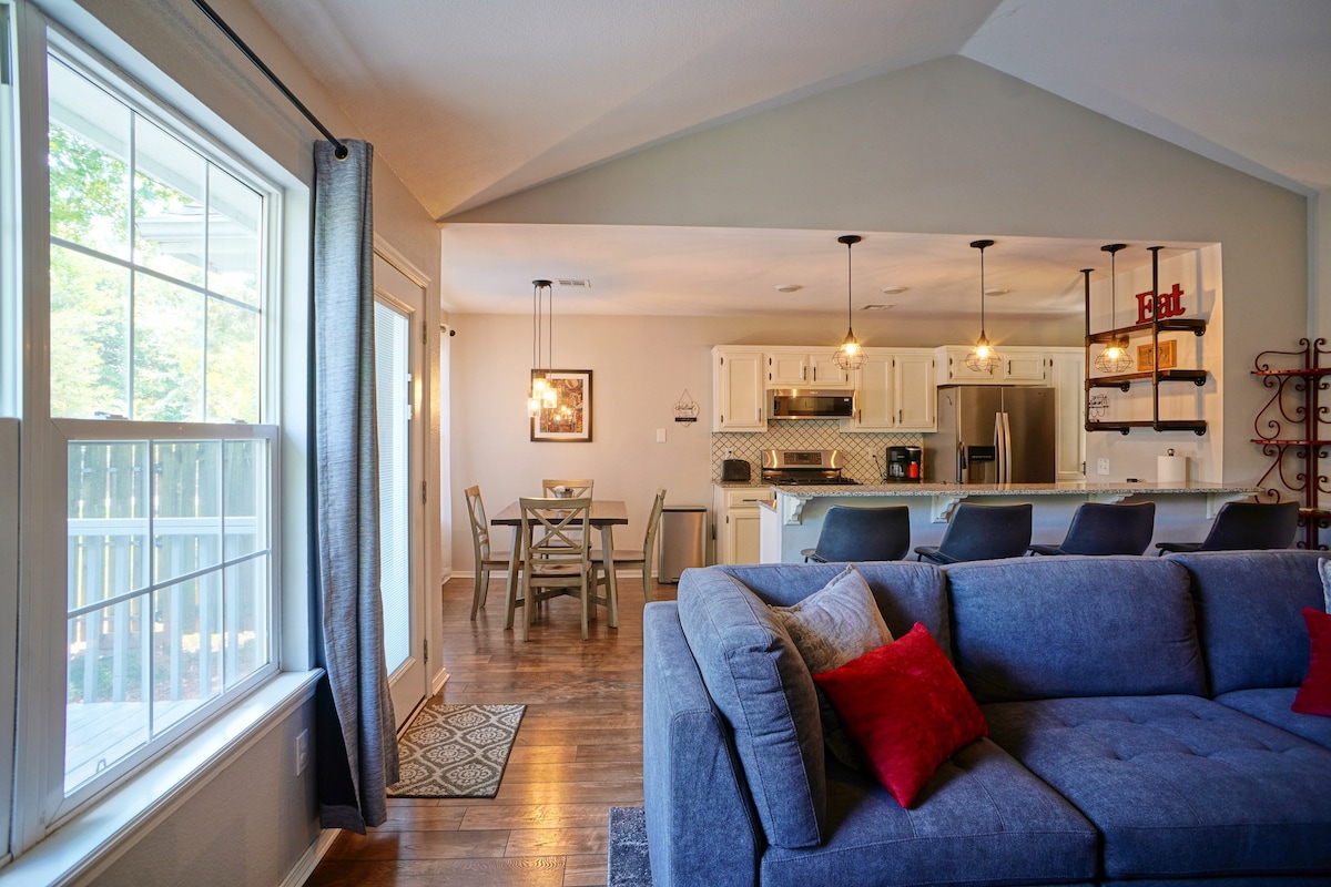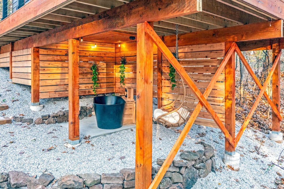 Welcome to Pedal and Perch, a custom-designed and built accessory dwelling cabin just minutes from downtown Bentonville, AR, Walmart HQ, and miles of incredible mountain biking. Enjoy a serene setting that tucks you among the trees and makes you feel like you are staying in your own treehouse. The cabin features a custom kitchen, one bathroom, a queen bed in the loft, a pullout sofa on the primary floor, and your very own outdoor bathtub looking in to the valley below.