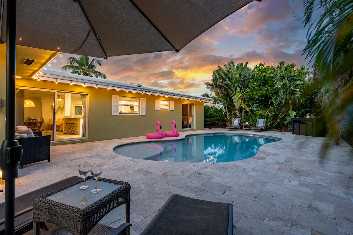 Te damos la bienvenida a tu refugio tropical privado, a solo minutos de la playa. Esta casa de estilo bohemio cuenta con un diseño amplio y abierto, una decoración elegante y una increíble piscina de agua salada y un patio al aire libre, perfecto para relajarse, hacer una parrillada o disfrutar del sol de Florida. Caminá hasta el acceso a la playa y, para que sea aún más fácil, te ofrecemos un carrito de playa, sillas y sombrilla para tu estadía.