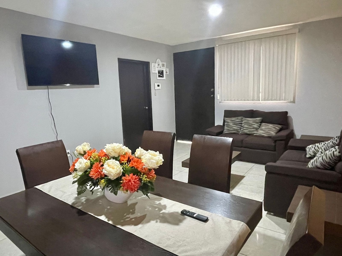 Departamento bonito y amplio, ubicado cerca de vías rápidas, ideal para venir a vacacionar o trabajar. Ubicado en el primer piso, comparte área con solo 2 departamentos. Estamos a unas cuadras de una avenida que conecta con las dos más importantes de la ciudad: Periférico y Salvador Nava. Al estar cerca de plazas comerciales, tienes acceso a entrega de comida rápida.
