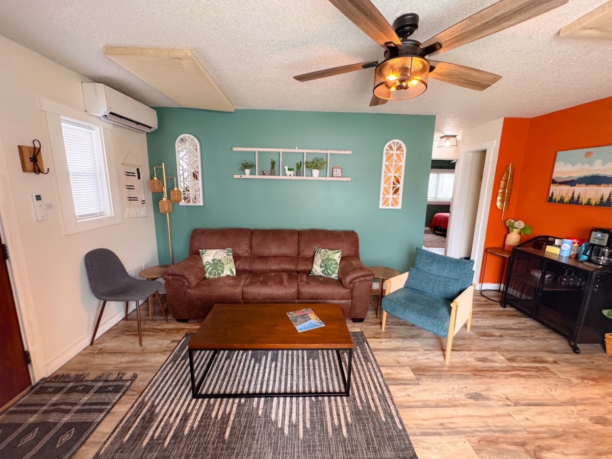 Sunrise Ridge con amplia zona al aire libre. ¡Entrada privada, aparcamiento y zona de patio! El apartamento está debajo de la casa principal; planta baja, sin escaleras. Detalles rústicos modernos, baño/cocina elegante remodelado con todas las comodidades para hornear/cocinar. Wifi y Roku con acceso gratuito a Netflix, Disney +, Max en TV de pantalla grande. Un dormitorio: cama tamaño king con litera tamaño individual; futón de tamaño completo en la sala de estar. Descuento por estancia de 4 a 7 días. ¡Sin gastos de limpieza! Mira las fotos y la descripción, ¡tal vez sea la opción adecuada para tu grupo!