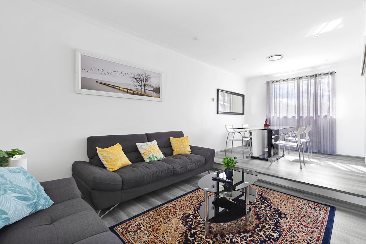 Casa adosada de 2 camas amueblada Lux, con aire acondicionado. Capacidad para hasta 6 huéspedes. Completamente preparado para estadías largas o cortas. Lavadora y secadora. 2 camas tamaño queen de lujo, 1 sofá cama. Un montón de estacionamiento gratuito en la calle para el segundo auto, cocina totalmente equipada con electrodomésticos europeos, a 2 minutos de excelentes centros comerciales. Restaurantes y cafeterías a tu alcance. 5 minutos en auto de M4 y M7. Cerca de todo el transporte público. A 45 minutos del aeropuerto de Sídney y del CBD. A 10 minutos a pie de la estación de tren de St Mary. A 20 minutos de las Montañas Azules.
