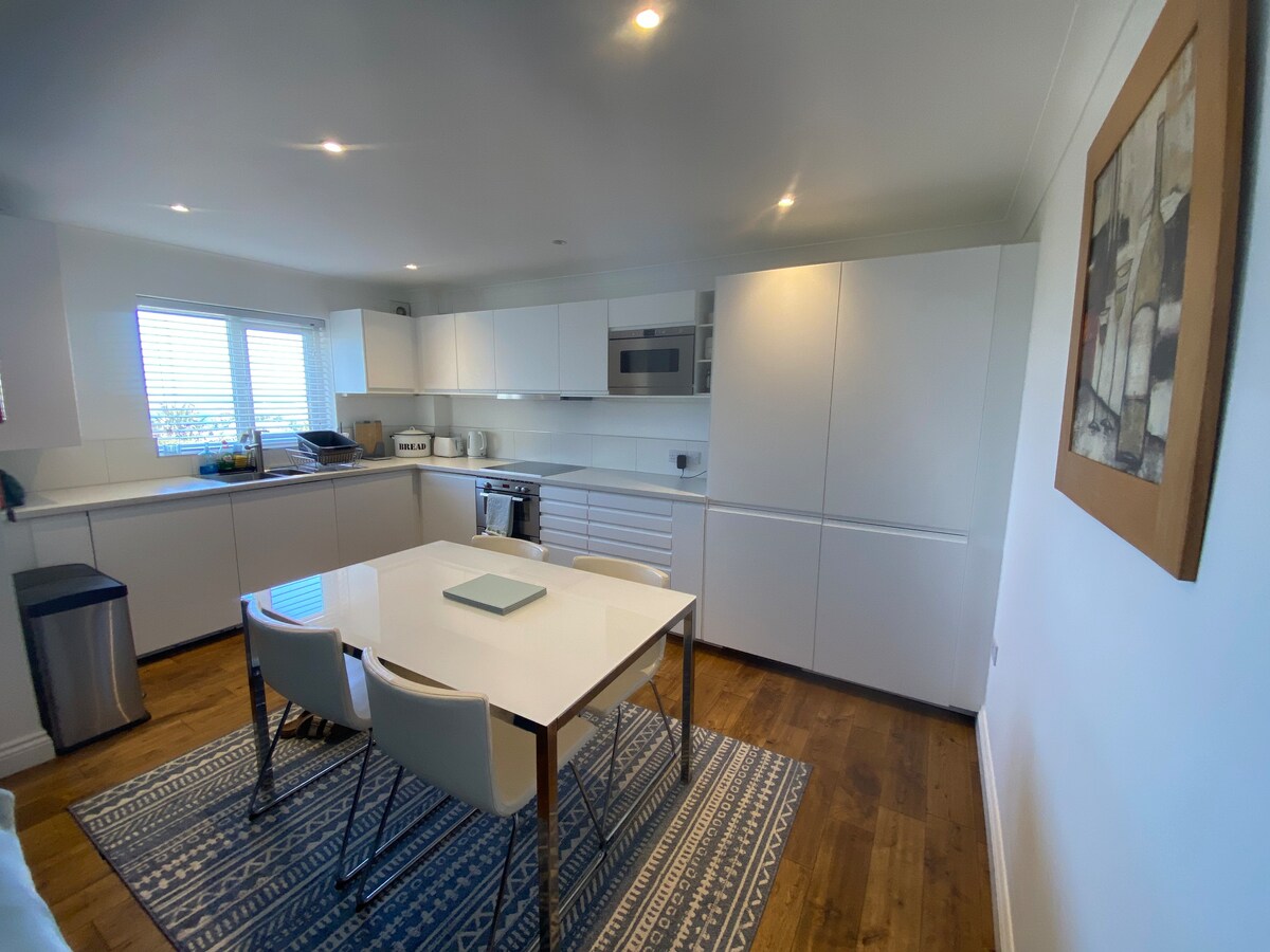 «Apartamento moderno y elegante en el primer piso. Creado pensando en la comodidad y la relajación. 2 dormitorios grandes. Gran baño con ducha. Segundo baño/ducha. Amplia sala de estar de planta abierta y cocina bien equipada. Barra de desayunos, para cenas informales o formales. Balcón, con impresionantes vistas de Fistral (playa de surf n .º 1 del Reino Unido) y campo de golf. Calefacción por suelo radiante completa. Aparcamiento para 1 coche. Fácil acceso al Grd fl. trastero. Sube directamente a la puerta del apartamento. Ducha exterior. Cerca, extra en el aparcamiento de la calle. Cómodo y relajante.