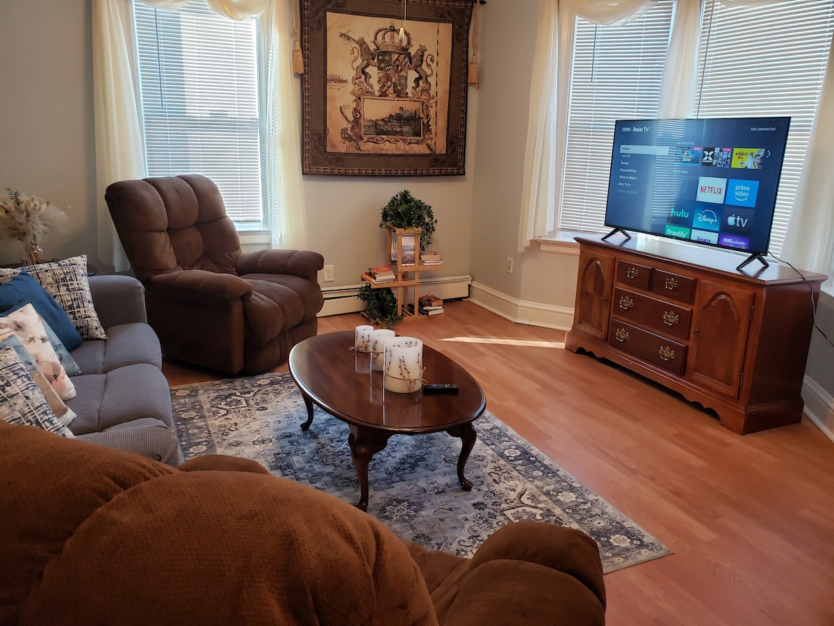 Welcome to Your Home Away From Home! This charming 1-bedroom apartment with a queen sofa bed in the living room, is nestled in the historic and vibrant heart of Hartford, offering the perfect combination of comfort, convenience, and local charm. The apartment features a spacious bedroom with a cozy queen-sized bed, and tasteful decor. The inviting living area is perfect for relaxing after a day of exploring the city. fully equipped kitchen and dining area. Each room is furnished with a 55” TV.