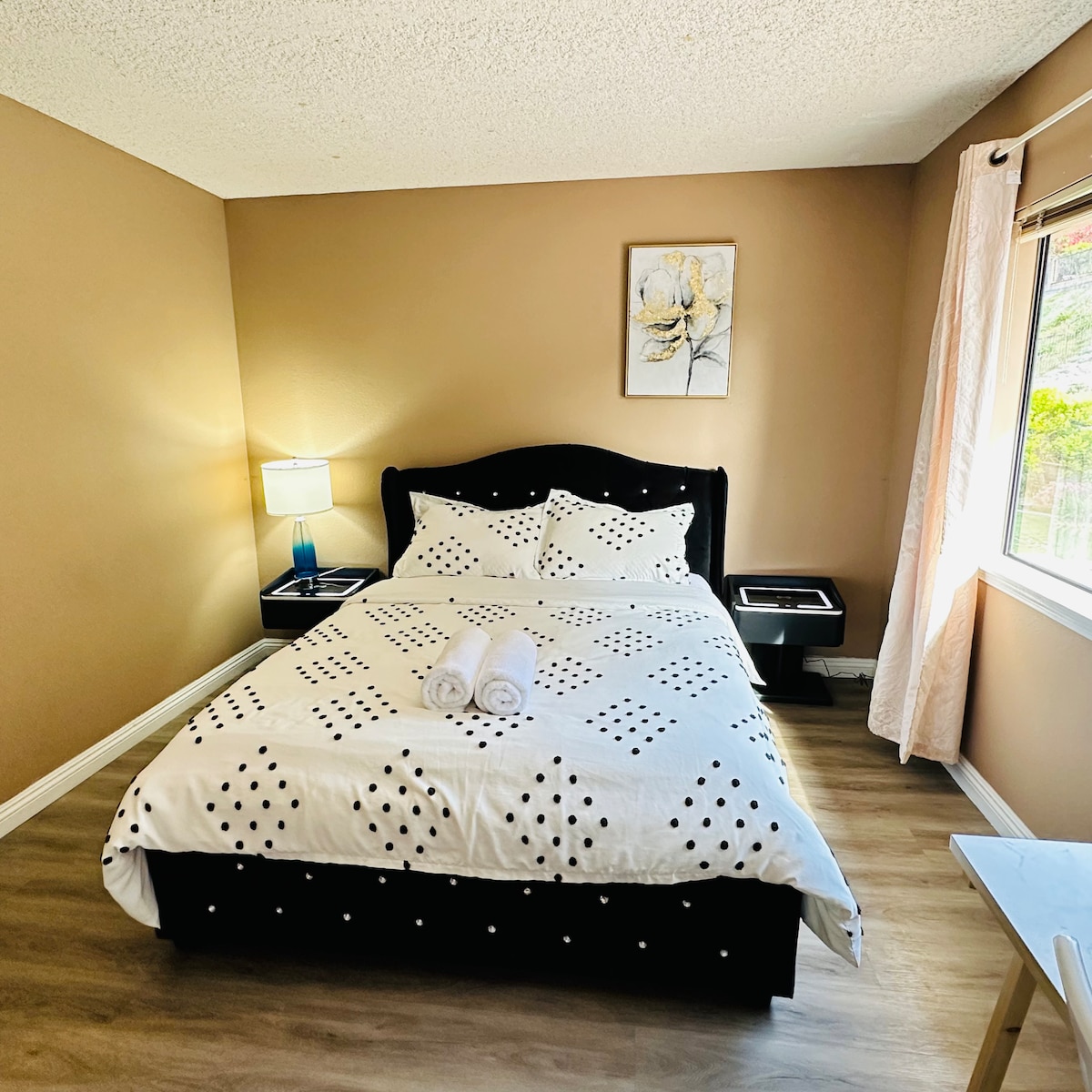 Fully private with its own entrance and exclusive patio. •Private entrance •Private bathroom •Small Kitchen •Private Patio •Self check-in •Smart lock system •1 queen bed and 1 sofa •Smart TV, fridge, microwave •12 miles from Disneyland •34 miles from LAX •Close to shops and restaurant •Quiet neighborhood.