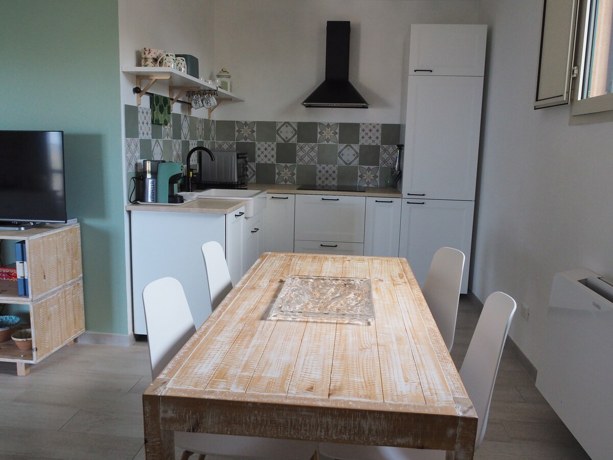La casa tiene vistas a un amplio espacio abierto con una pequeña cocina al aire libre y un jardín con diferentes tipos de plantas mediterráneas y árboles que rodean la villa. En la planta baja hay una gran cocina y sala de estar con chimenea y sofá cama; arriba hay un dormitorio doble y uno con 2 camas individuales, una antecámara, un balcón, el baño. Todas las habitaciones tienen calefacción, ventanas (con red) y armario. Hay aire acondicionado en la planta baja y en el primer piso.