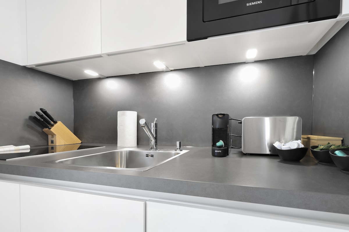 Alójate en 1 de un alojamiento Estudio Superior situado en el corazón de la ciudad. - Muebles de diseño (Saba Italia, Perdali y más...) - Cama de primavera con camas de lujo de capullo, tamaño de cama: 160 x 200 cm, ropa de cama de satén, ropa de cama como en hoteles de lujo. - cómodo sofá, TV inteligente. - comedor y escritorio propios. - Cocina totalmente equipada. - Acceso a la casa y al departamento con un PIN con check-in anticipado en línea. - Lavadoras y secadoras en el sótano a través de WeWash. - Limpieza semanal.