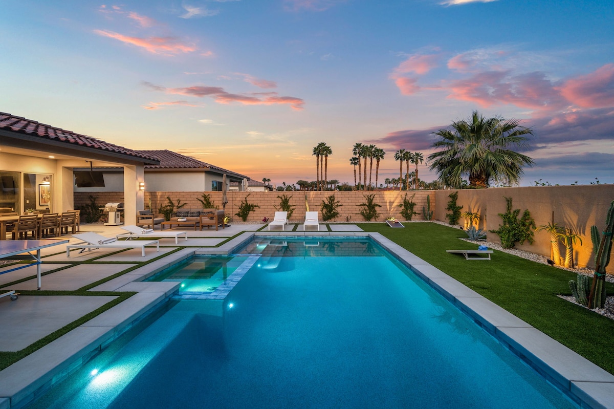 #226300 Find your oasis in the desert at this ultra-private, family-friendly home. From its luxury interior with high-end finishes, to a beautiful backyard retreat, you’re sure to find your own favorite spot while staying at The Alvarado. Lounge in the sun, splash in the pool, and soak in the hot tub while you watch the sun set over the Santa Rosa mountains. In the evenings, gather around the bbq, outdoor dining table and built-in fire pit. A perfect day without ever leaving the property!