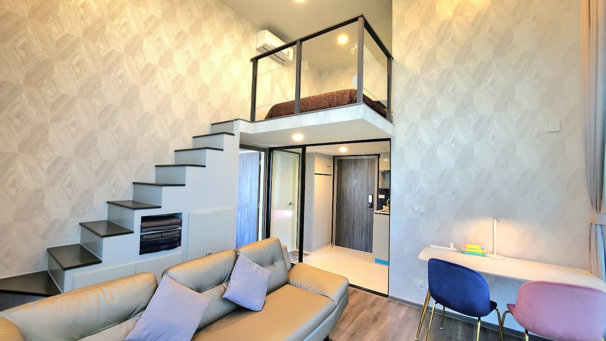Te invitamos a elegir y alojarte en mi apartamento y espero que tengas un gran viaje a Tailandia. La casa está en Rama9, departamento LOFT entregado en 2024.La habitación mide unos 40 metros cuadrados, incluyendo un dormitorio, una sala de estar y comedor, una cocina y un baño, con capacidad para 3 adultos. (‼️ tps: cuando el número de personas en la reserva es de 1 a 2, por defecto solo hay una cama en el dormitorio, si necesita agregar un sofá cama, complete el número de personas como 3 en el momento de la reserva y contáctenos después de la reserva para informarnos, organizaremos al personal para preparar el sofá cama antes de su estadía‼️) El precio de la reserva incluye el uso de toda la casa, así como el gimnasio, la pileta y el espacio de oficina compartido.