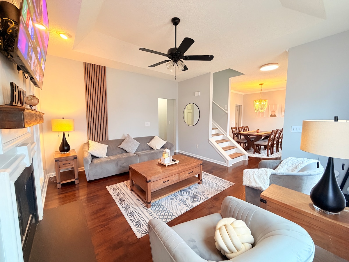 Enjoy a stay 3 miles from Main Street and the Swamp Rabbit Trail. Perfect for a romantic getaway or solo retreat, enjoy a cozy electric fireplace, a spacious king bed, and a fully equipped kitchen. The covered deck with string lights and outdoor dining sets the scene for relaxing mornings and intimate evenings. Thoughtfully designed for comfort, this peaceful escape keeps you close to top attractions.