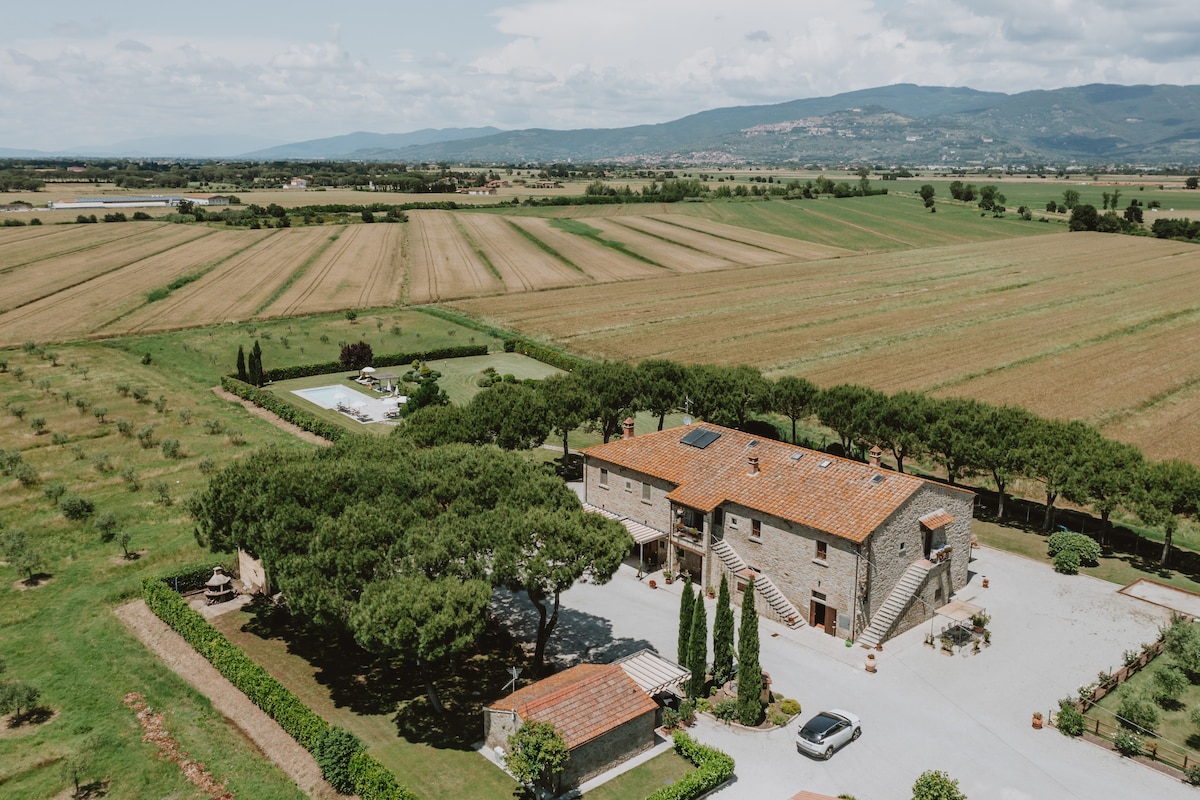 La finca Terra di Cortona se encuentra en una posición estratégica entre el bello pueblo toscano de Cortona y el Lago Trasimeno. Las finca alberga cinco amplios apartamentos y tiene una historia que se remonta a finales del siglo XVII, cuando una familia noble lo construyó como residencia campestre. Dispone de aire acondicionado, así como de televisión vía satélite y acceso a internet. En el jardín de la finca hay una piscina con solárium, barbacoa y un campo de voleibol.
