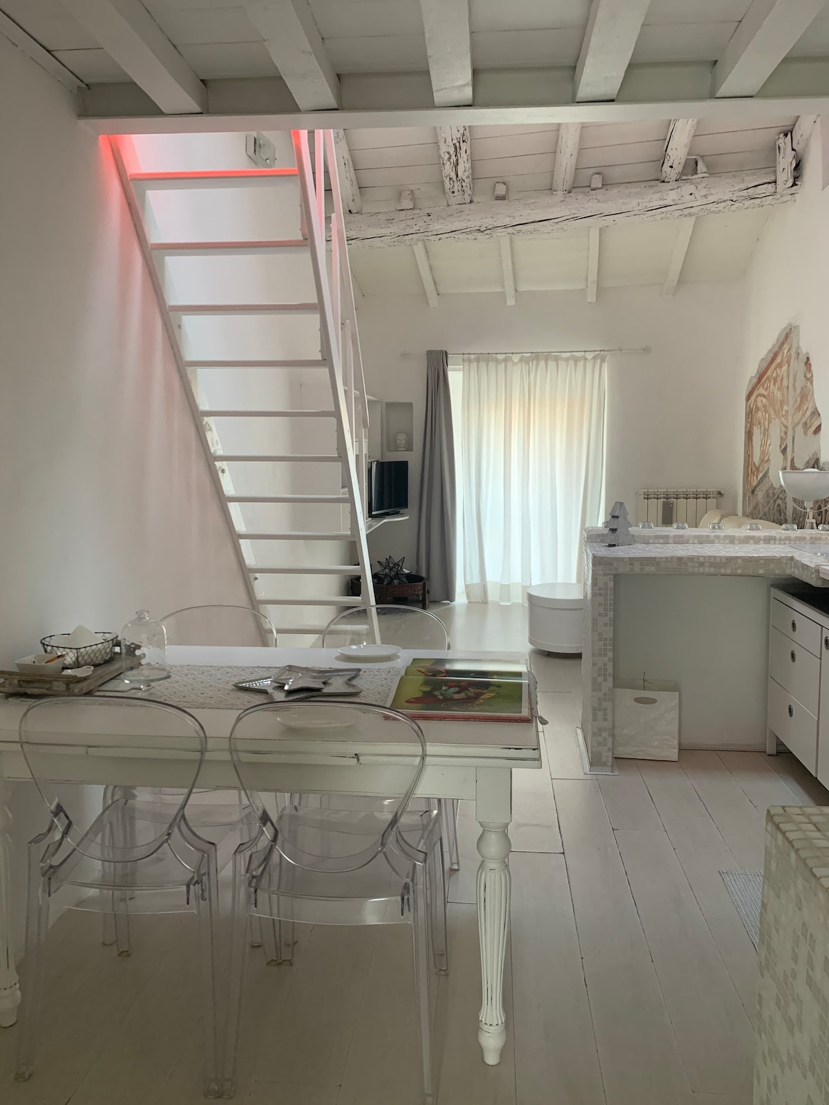 Este ático luminoso está amueblado con todo lo que necesitas para una estancia agradable: una cocina espaciosa con utensilios de cocina, una estufa de inducción, un microondas, un televisor inteligente, Netflix, Wi-Fi, un altavoz Bluetooth, aire acondicionado, una lavadora y una cómoda cama doble debajo de un impresionante fresco del siglo XII. Todo el departamento está disponible en el tercer piso (sin ascensor), en el barrio más animado de la ciudad, a solo cinco minutos del metro.