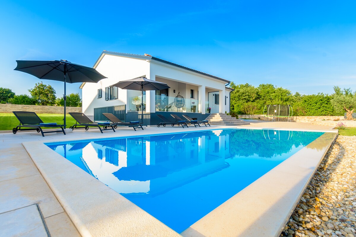 Stylish villa near Rovinj with picture worthy pool, sunk in hot tub, sauna. Wake up to lush, panoramic valley views. Couples and family-friendly, a short drive to adventure park, Brijuni National Park, dinopark, medieval towns & local cuisine. It is a true green escape for anyone looking to get back to nature with all the comfort of modern living. Fully equipped for cooking and entertainment in 2600 m2 of garden (football, speed ball, badminton & pool fun) for your kids and loved ones to enjoy.