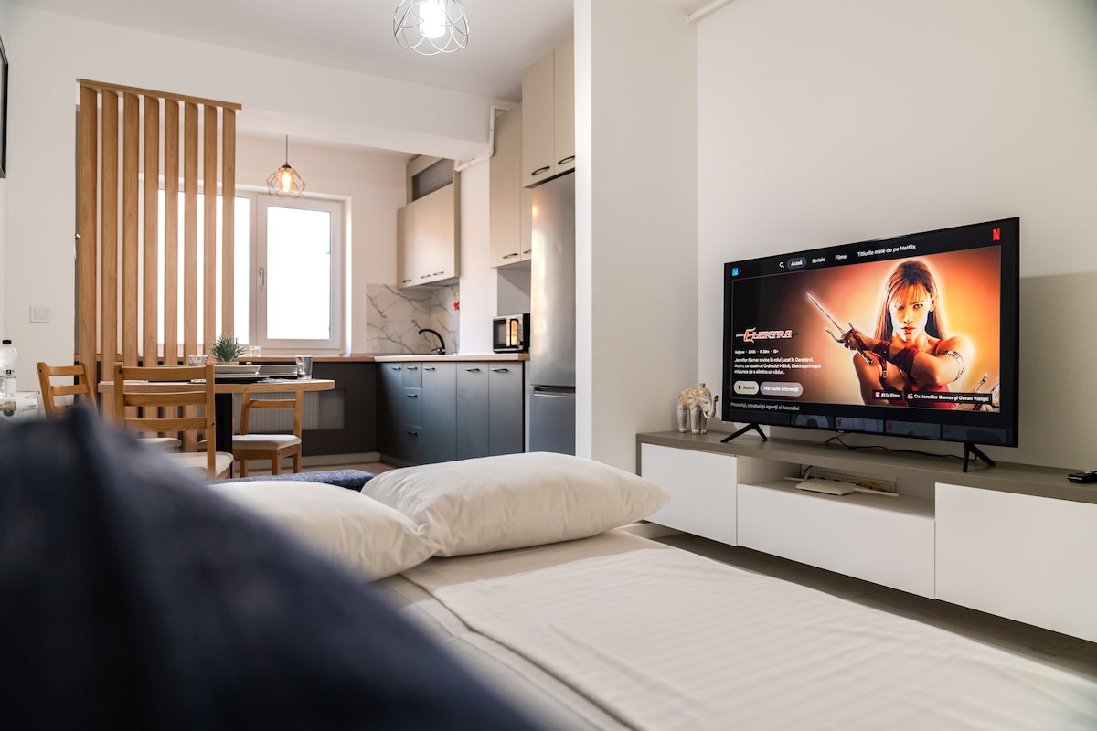 Bright and spacious studio apartment located in a 10 floors building, newly renovated with a fully equipped modern kitchen with an electric hob, integrated fridge and refrigerator, and all other necessary kitchenware for making a gourmet meal. It is placed in a great area with quiet neighbourhood, less than 15 minutes to City Centre, with direct public transportation to the old town, close to a big variety of beautiful parks and lakes such as Tei, Plumbuita, Circului. Free car park available.
