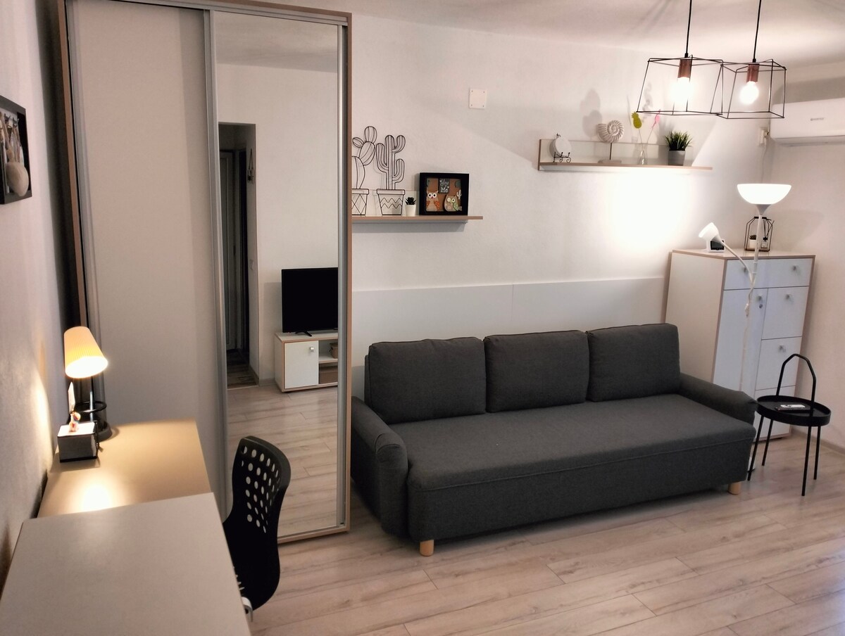 Lugar completamente nuevo decorado con muebles y electrodomésticos nuevos, ubicado cerca del centro de la ciudad (a unos 500 metros a pie), con supermercados cerca. El estudio del primer piso (sin ascensor) tiene una zona de dormitorio con un sofá extensible para 2 personas. El estudio cuenta con cocina totalmente equipada, nevera, cafetera expreso, horno microondas, placa de cocción a gas, lavadora, aire acondicionado, cable gratuito, TV inteligente y wifi gratuito. Aparcamiento privado y público gratuito cerca del edificio.