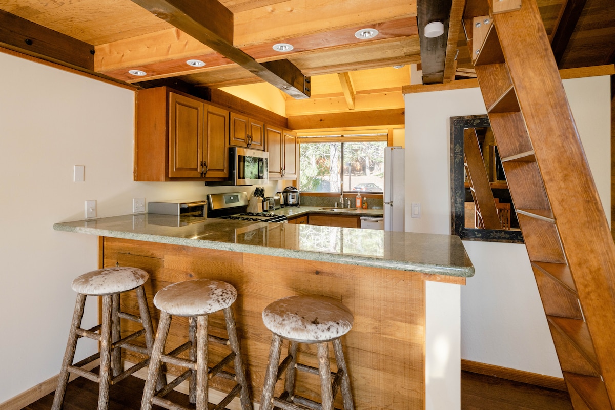Escape to our Craftsman cabin—where mountain charm meets modern comfort. Just six blocks from the lake, perfect for up to 4 guests: cozy up by the gas fireplace, cook in the fully equipped kitchen, and unwind in the clawfoot tub or infrared sauna. Two dedicated desks make remote work easy. Step out the back to wooded trails with a creek and lake views; walk to the beach and local restaurants, and reach top ski resorts ~15 minutes away. The ideal base for a restful, memorable stay.