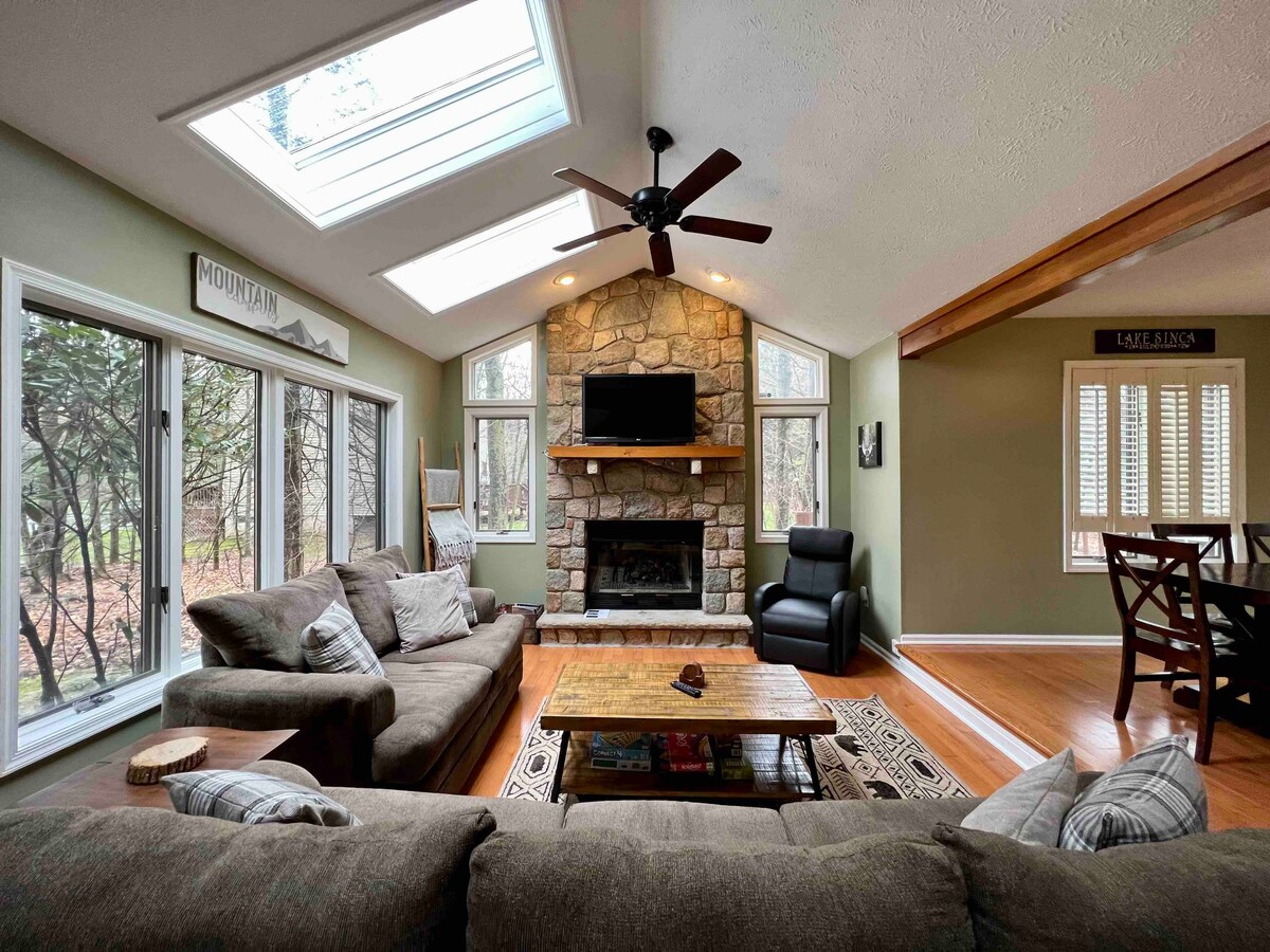 ¡Te damos la bienvenida a Woodbury Lodge! Recién reformado con aire acondicionado, calefacción y electrodomésticos nuevos. ¡Convenientemente ubicado entre estaciones de esquí, parques acuáticos, Pocono Raceway, casinos, restaurantes, senderismo y actividades para cualquier temporada! La comunidad privada incluye el lago Sinca, que está bien cuidado, donde podrás relajarte en la playa, hacer barbacoas, pescar y los niños podrán disfrutar del parque infantil. Nuestra casa ofrece una gran terraza, parrilla, chimenea, futbolín, videojuegos o acogedora chimenea en la sala de estar y TV.