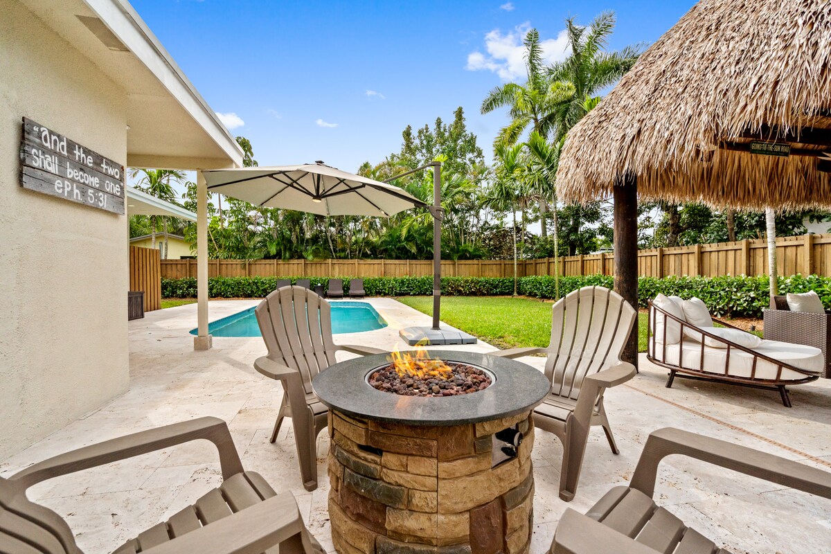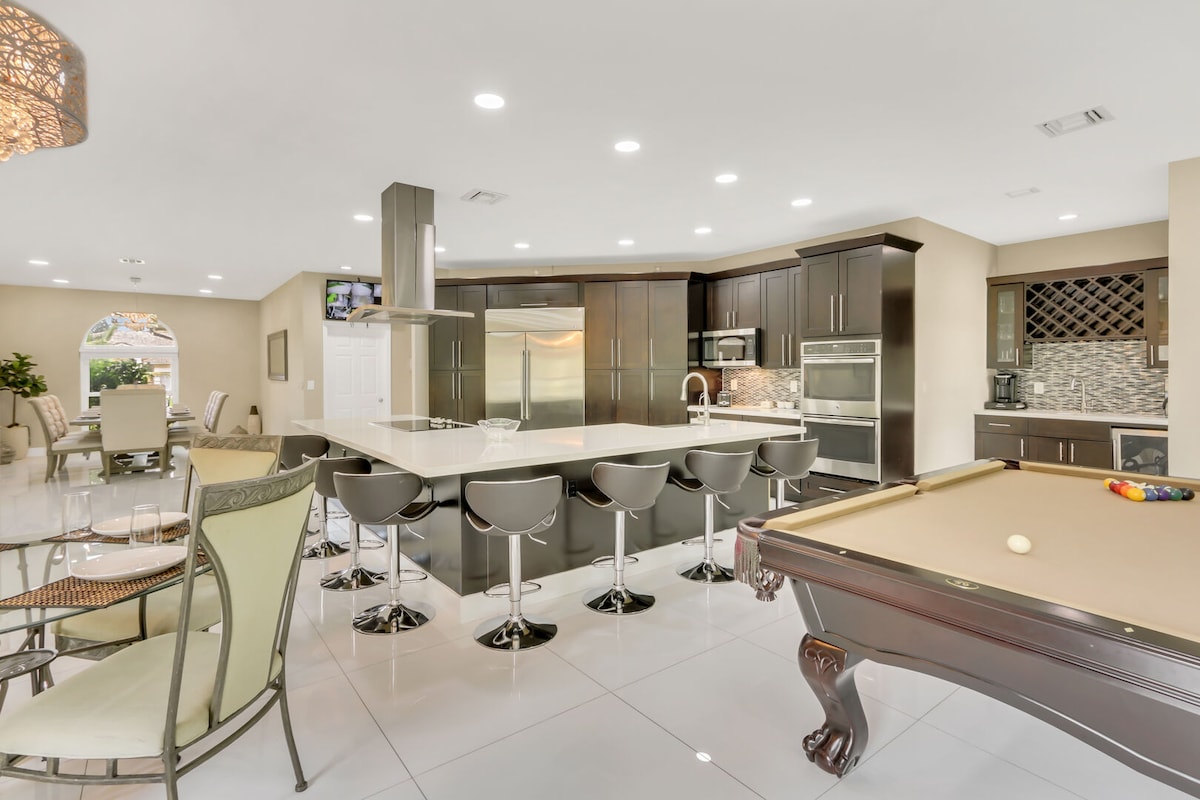 ¡Saluda a esta hermosa casa de Florida! Este espacio de lujo incluye 2 salas de estar abiertas, una cocina moderna con asientos en la parte superior del bar, oficina, 3 amplios dormitorios, 4 baños completos y una casa con piscina con sauna. Los huéspedes también disfrutarán de un oasis privado en el patio trasero que contiene piscina, spa climatizado, tumbonas, chimenea, comedor, cocina al aire libre con fregadero, mini nevera, parrilla para barbacoa y una cancha multi deportiva de tamaño completo y campo de fútbol.