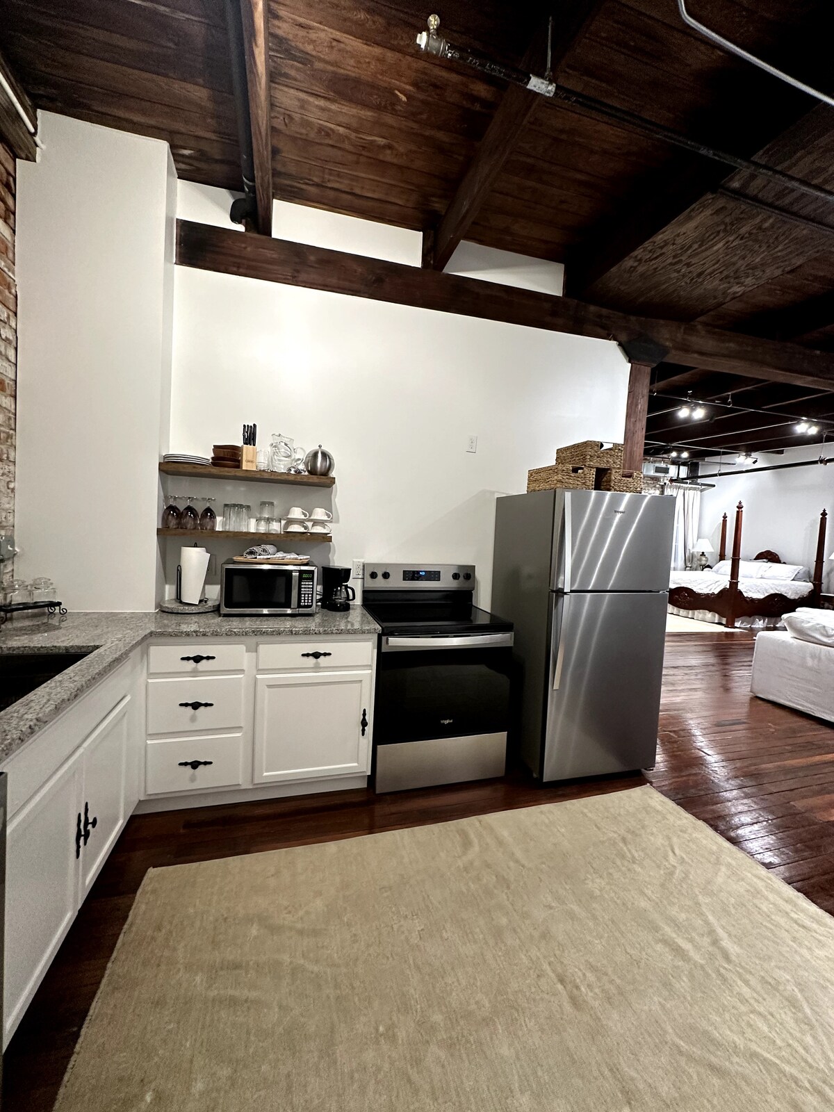 Two miles from the interstate, The Barn is on three acres of peaceful private property. As you pull on to our road The Barn is to the left of our home. Parking signs are clearly marked. The Barn - Downstairs is a 600 square foot efficiency apartment with a comfortable king size bed, a kitchenette, a den area with a queen size sofa sleeper, a bathroom with a shower and a 55” TV that swivels. Amenities include a patio, a charcoal grill, a fire pit, a pond for fishing, and a nature trail.