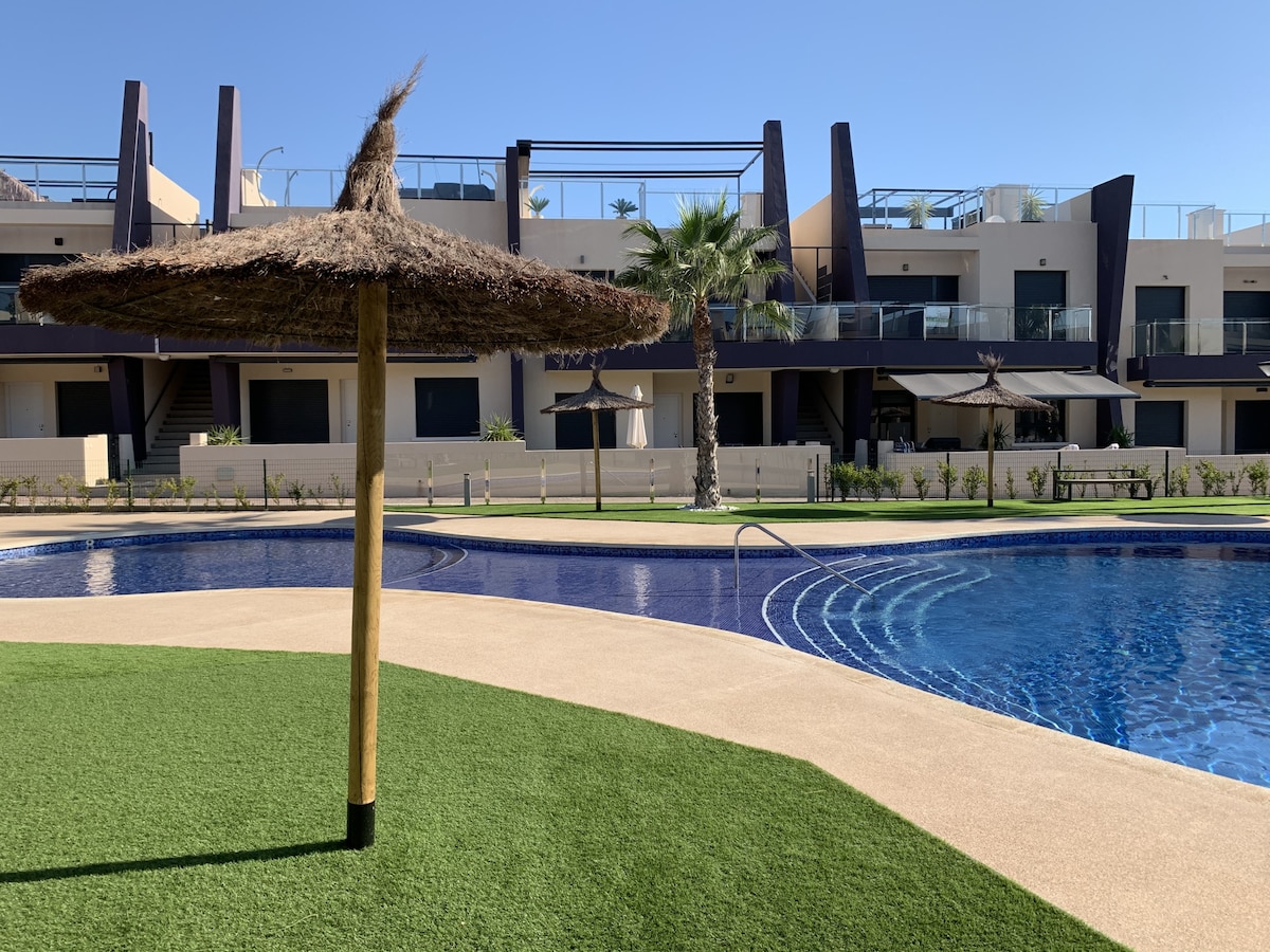 Buscas unas vacaciones en una localización moderna, a pocos metros de la playa? 'Bianca Beach' es perfecto para disfrutar en pareja, con familia o amigos. Construido en 2020, este residencial privado y completamente cerrado con muro perimetral tiene 2 piscinas. Está a 2 minutos andando de la playa Mil Palmeras, con 10 meses de sol al año. Este apartamento en planta baja está completamente equipado, con mucha luz. Lo más atractivo son sus terrazas, una con orientación sur y otra norte.